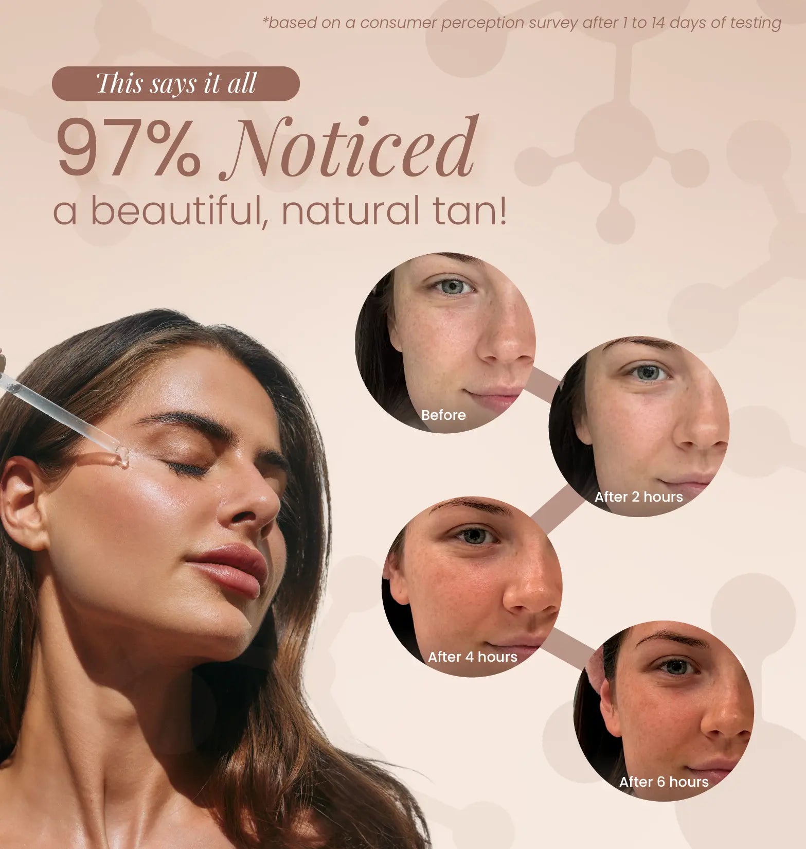 The tan develops in 4-6 hours, with no streaks, orange tones, or bad smells. For a continuous glow, you can apply the hyaluronic acid tanning drops every few days. Depending on your desired tan, you may need to reapply as the tan fades. Perfect for all skin types, these tanning drops leave your skin smooth, hydrated, and glowing!